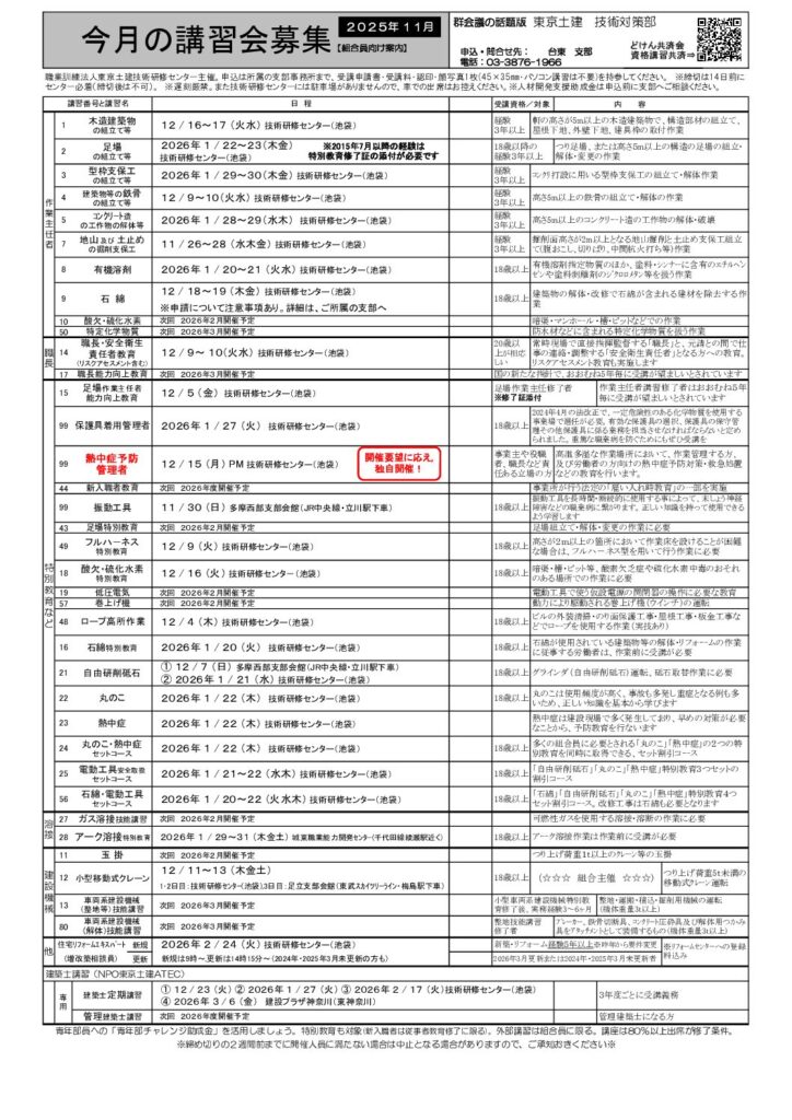 東京土建技術研修センターでは、作業主任者、技能講習、特別教育、受験準備講座などの各種講習会を開催しています。