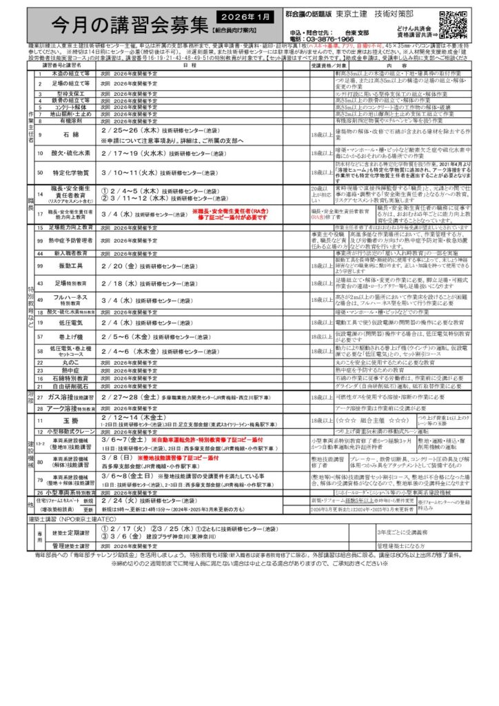 東京土建技術研修センターでは、作業主任者、技能講習、特別教育、受験準備講座などの各種講習会を開催しています。