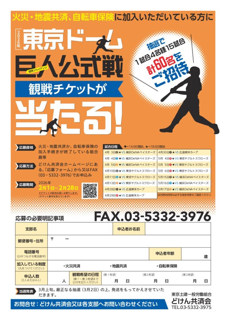 どけん火災共済・地震共済・自転車保険にご加入の方を対象とした読売ジャイアンツの東京ドーム公式戦の抽選キャンペーンを開催。